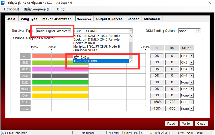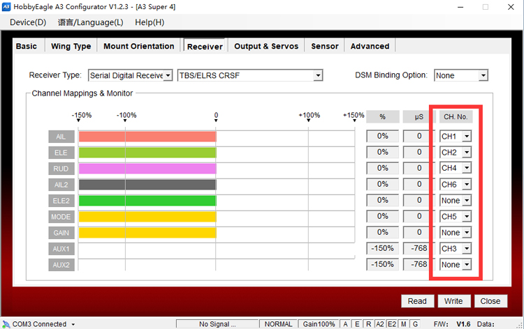 Download the latest A3 Configurator (V1.2.3 or later), or upgrade the Program Card X to the latest version (V1.6 or later), change the receiver type of the gyro to "Serial Digital Receiver->TBS/ELRS CRSF" mode and setup the channel mapping to match the channel order of the transmitter, then restart the gyro to make the new settings take effect.
